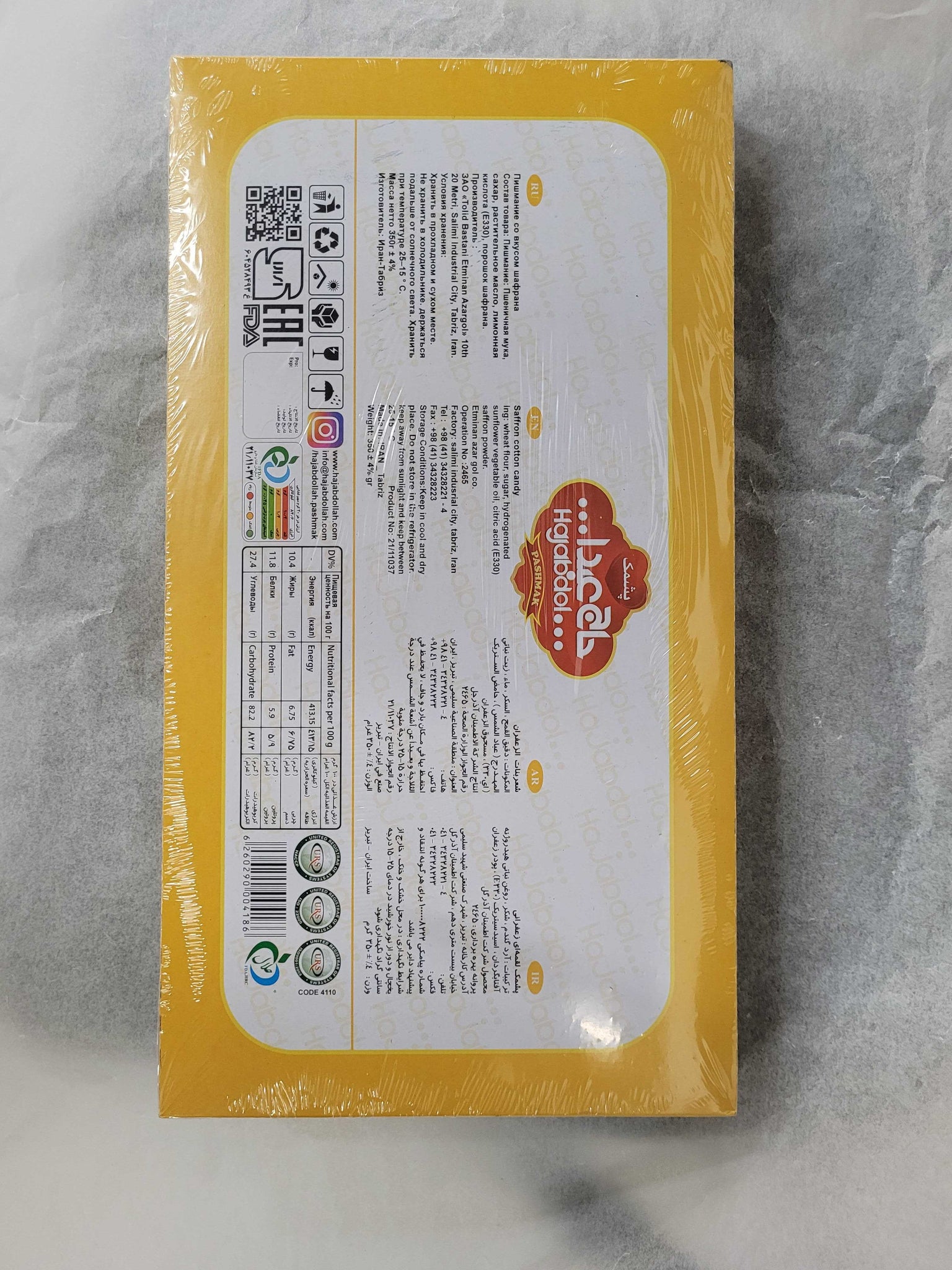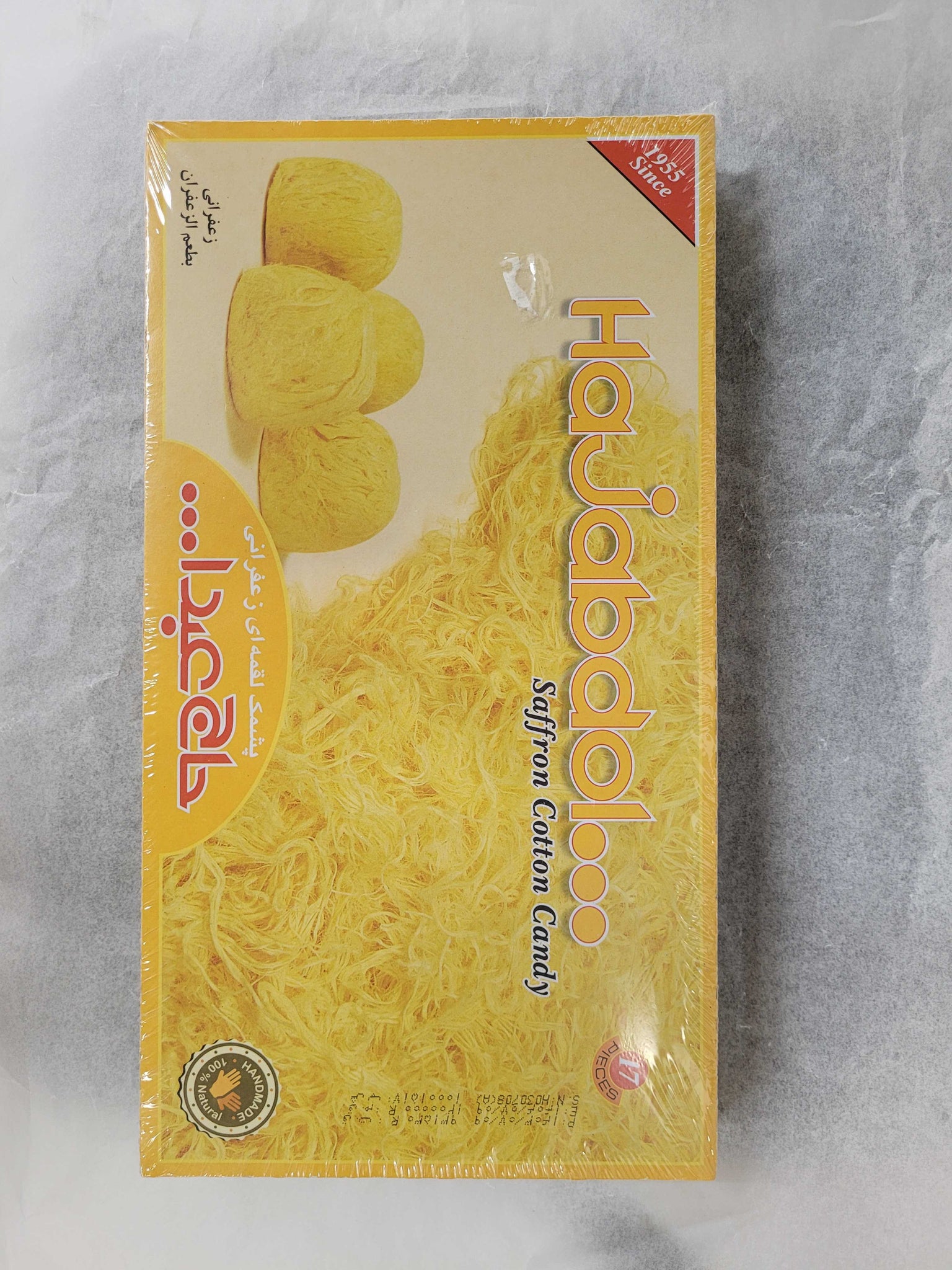 Hajabdollah Saffron Cotton Candy 350g – Indulge in the rich, aromatic sweetness of this premium Persian cotton candy, infused with real saffron for a luxurious treat. Available now at Super Khorak!